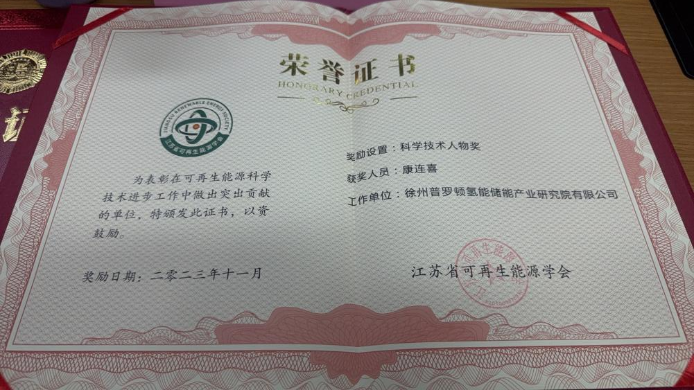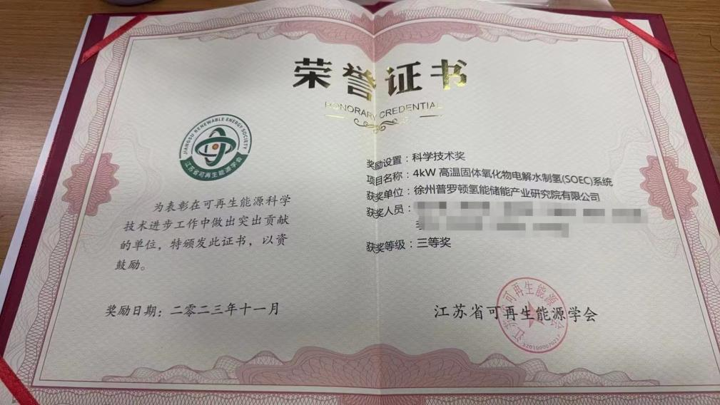在江蘇省可再生能源學會科學技術獎頒獎典禮中,質子動力徐州公司“4KW高溫固體氧化物電解水制氫(SOEC)系統”獲得科學技術獎,公司技術部負責人康連喜獲得科學技術人物獎。質子動力徐州公司做為科學技術獎獲獎單位,受邀在現場做了關于《SOEC研發產業化進展及ReSOC發展趨勢》的報告。